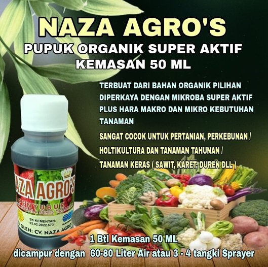 Pupuk Naza Agro’s Ramah Lingkungan berbahan baku dari bahan organik pilihan, diperkaya Mikroba super aktif, plus makro dan mikro nutrient, diproses berdasarkan tekhnologi berwawasan lingkungan dengan prinsip Zero Emision Concept, dengan Kandungan sbb :